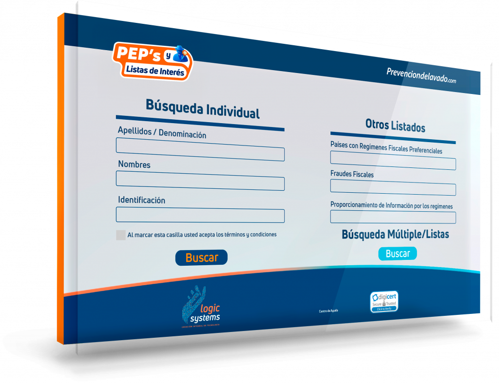 PEPs y Listas de Interés es la herramienta más sencilla y actualizada para la búsqueda online de personas y entidades en listas de PEPs (Personas Expuestas Políticamente), Sanciones internacionales relacionadas con terrorismo, Buscados por narcotráfico y otros delitos, etc., para cumplir con las normas de prevención de lavado de activos y otros ilícitos de naturaleza financiera.